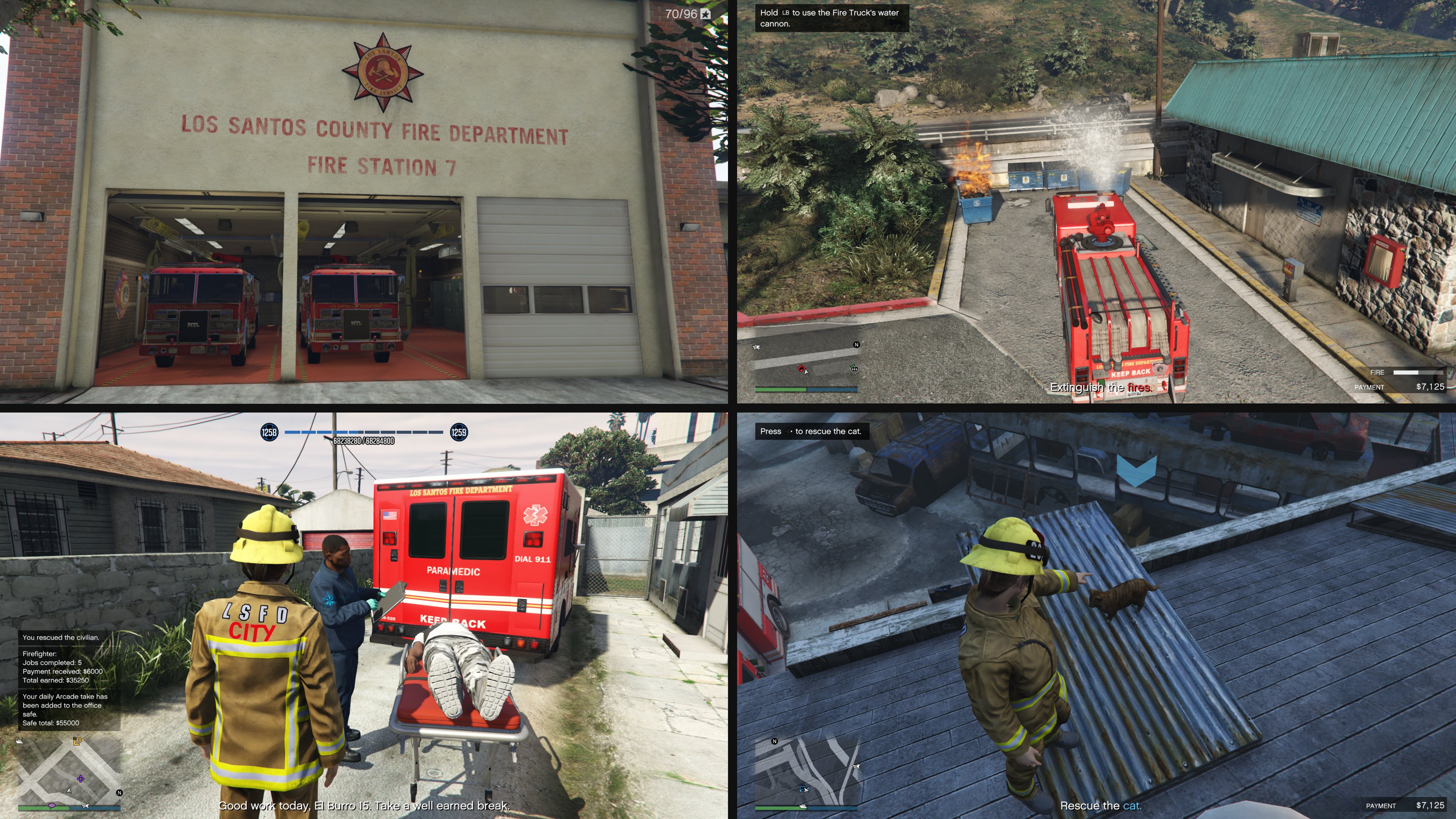 Fire Fighter (LS Fire Department) There are five missions to a shift and they pay around $7,500, so a good shift will pay approximately $35,000. Fires include automobile fires, dumpster fires, house fires (which may require a rescue in a smoke-filled house), gas leaks and cat rescues! Fires are extinguished with the aimable hose atop a fire truck, and one annoying issue is the difficulty in seeing where the water jet is actually going when aiming at a roof or upper window. Why Rockstar didn't give us an extra view or free camera for this is a mystery, but these missions are still good, challenging fun.